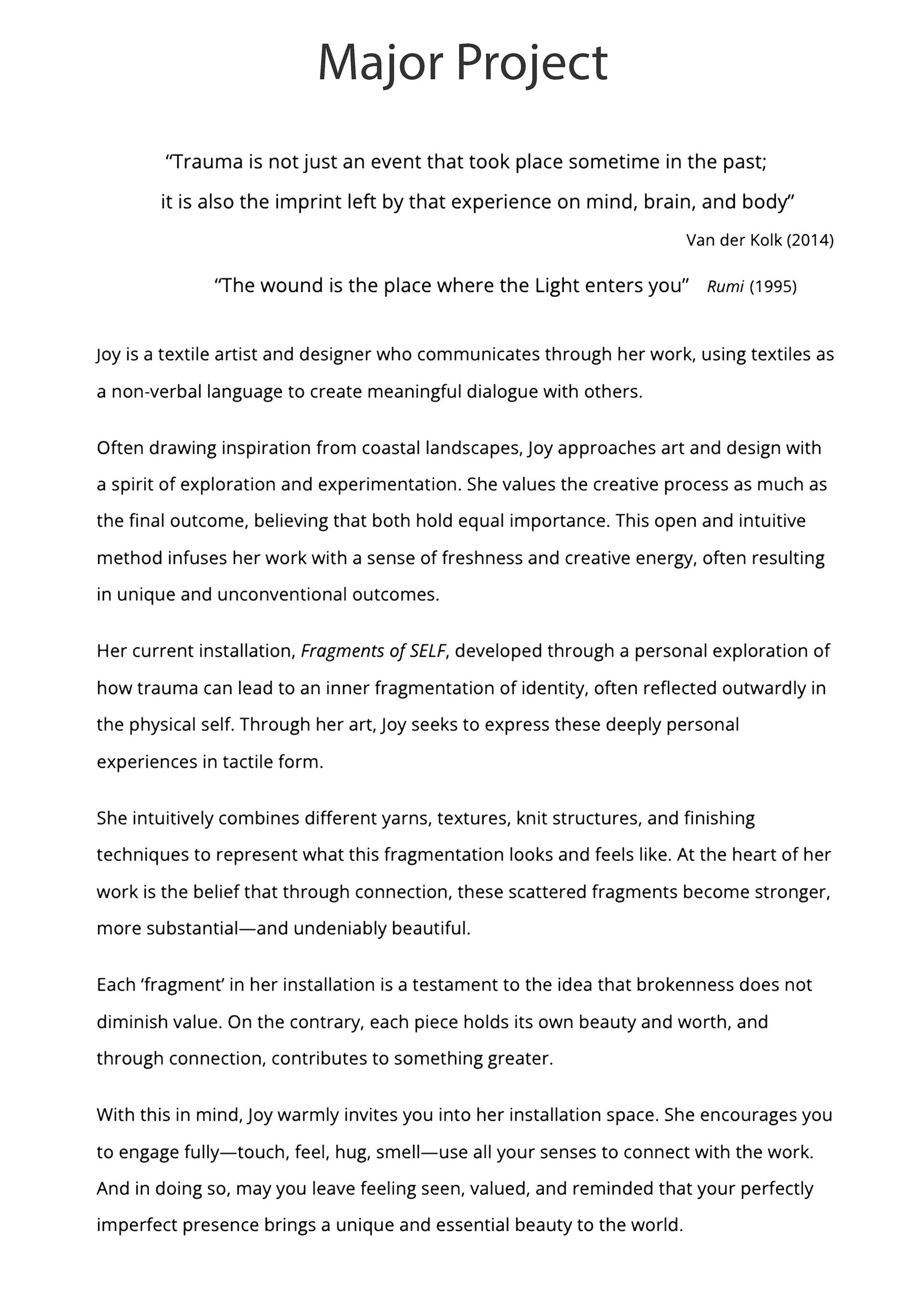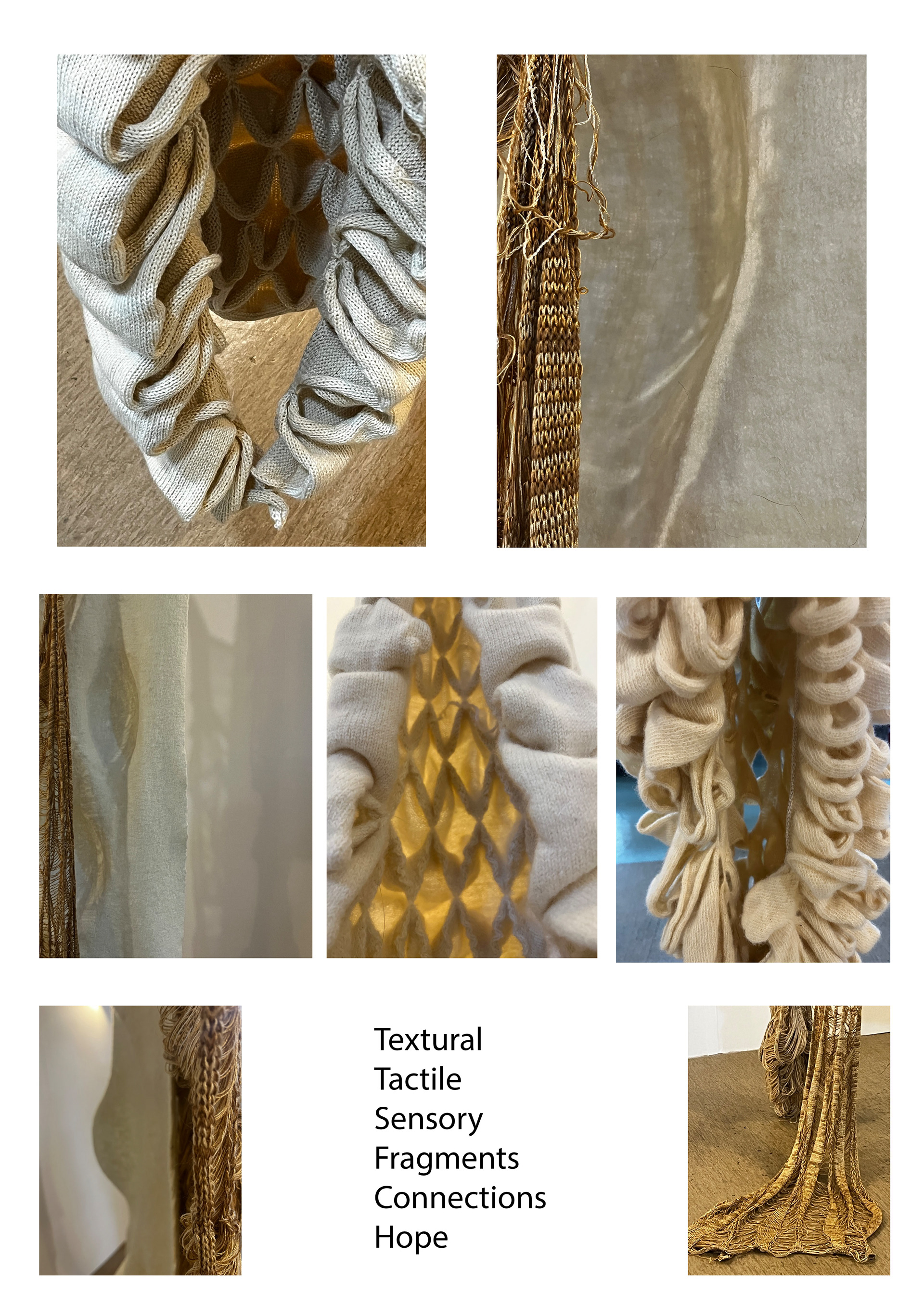 Major Project Installation, using textiles to convey my personal journey - embracing textiles as a non linear language that expresses so much more than words every could.